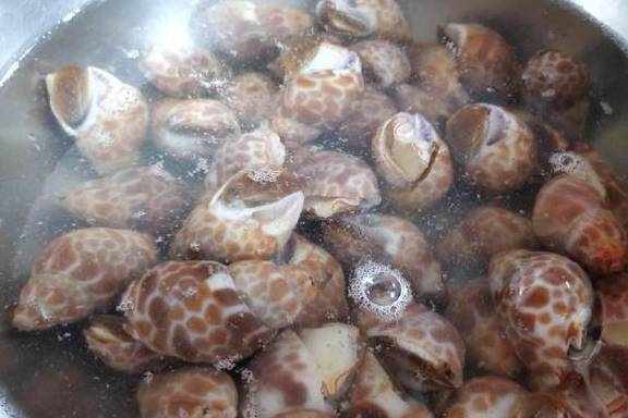 2.将洗好的花螺放入冷水中,小火加热到沸腾后,再加热30秒左右,将花螺捞出。