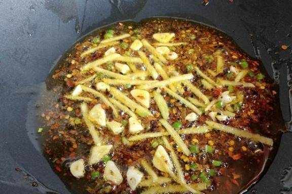 4.热锅热油,爆香葱蒜末,下辣椒碎和姜丝稍微翻炒几下。