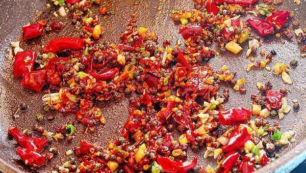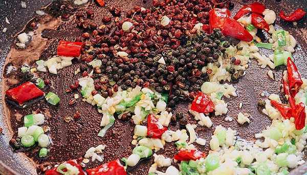 配料是花椒,干辣椒,生辣椒,葱蒜,现行下锅爆出味道,这里还是选用猪油炒菜,真的是别的油脂无法替代的香味。油多了也不要紧,多出来的直接就可以当作是辣椒油备用了。
