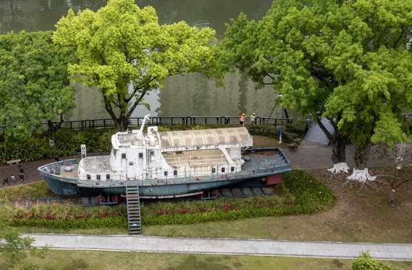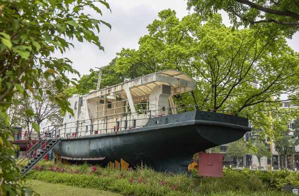 移步来到江边,但见一艘轮船静卧于铁轨之上,看起来颇有年代感,据说是当时的粤中造船厂制造的,长20多米,高约6米,属于轮船界的“小兄弟”,但小而美,有点翩翩佳公子的气质,也是岐江公园数个网红打卡点之一。