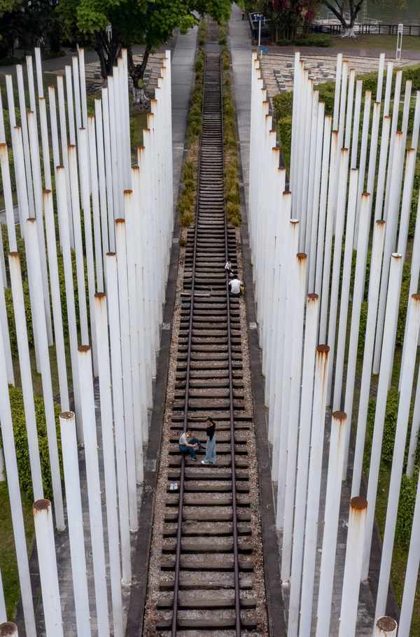 铁轨的旁边排列着一行行白色的圆钢柱,白天给人纯洁的感觉,在周边茂林的衬托下更显气质高雅。