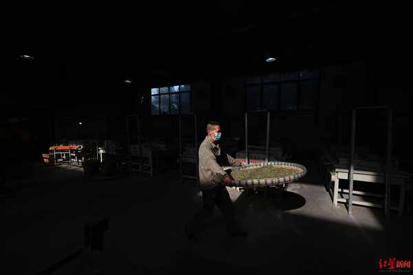 在茶厂,制茶机器马力全开,师傅们忙着炒制新茶、搬运茶叶。