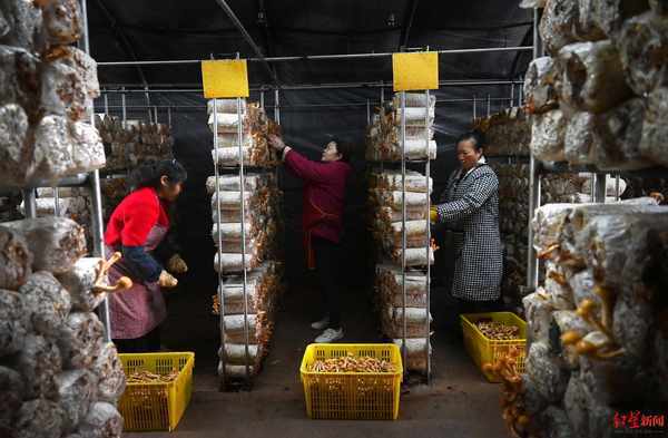位于金堂县竹篙镇的金堂县食用菌现代农业园内的然通家庭农场,采菌工人正将金黄肥厚的滑菇从一排排摆放整齐的菌包上摘下。上午农民采摘鲜菌,分包冷藏后,下午便发往市场。