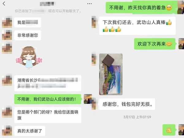 据了解,该游客在3月12日来萍乡武功山景区游玩时,不小心将钱包掉落,直到返回至长沙家中后才发现钱包丢失,四处寻找无果后,焦急地拨打了景区服务中心电话请求帮助。恰巧当天,萍乡武功山旅游集团武实公司安保部工作人员王勋建同志在游客中心值班时,在卫生间发现一个小钱包,经过值班民警清点,包里有现金1100元、还有银行卡等贵重物品,随后王勋建同志立即通过多种方式,成功联系到失主,并将物品归还。