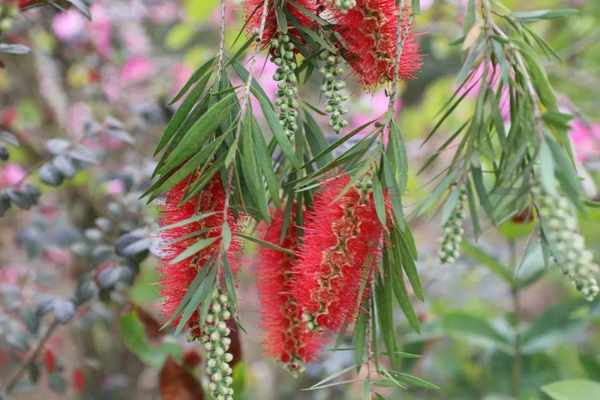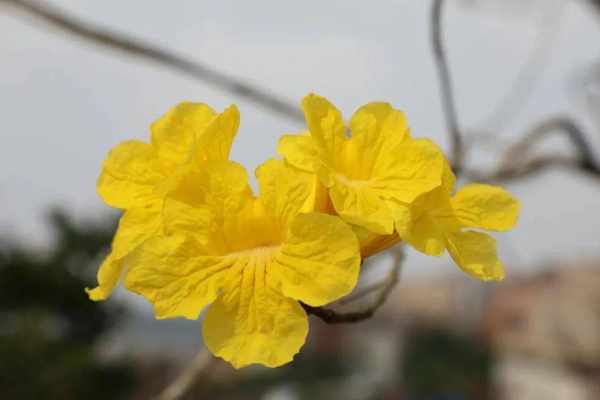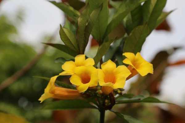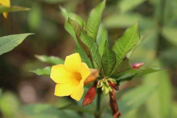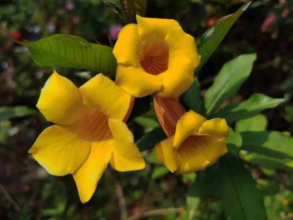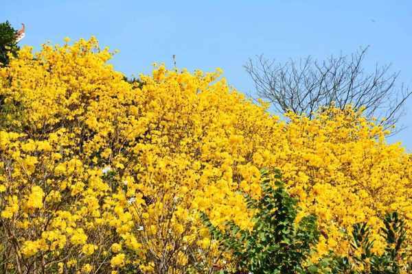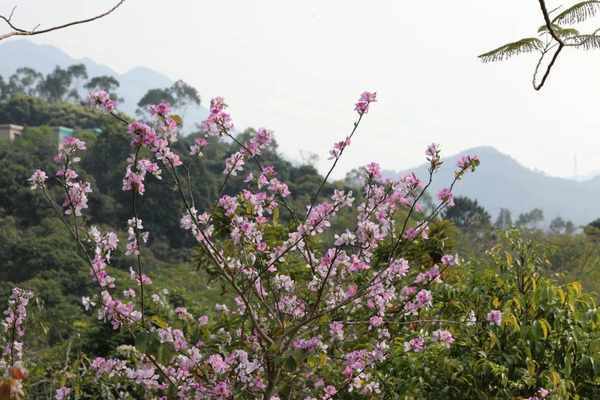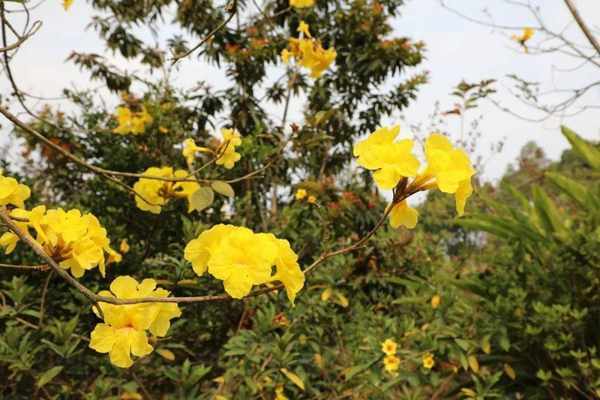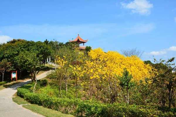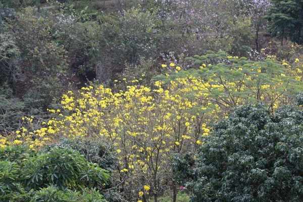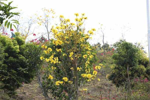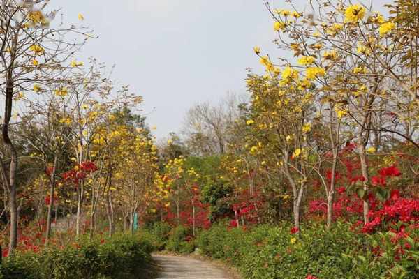 从饭堂旁往内院走,就能赏到她的花容盛髻。有些地方铺满黄花风铃,有些地方染得妍红。软风里吹送着青草香气,花朵笑靥迎人。浓淡得宜,疏密有致,尽你自在流连,尽情欣赏。