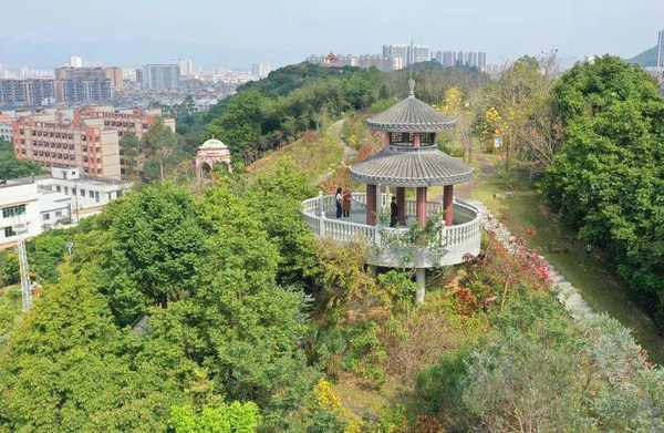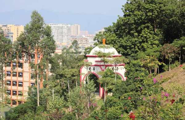 初次踏入明园,便见到蜿蜒小径藏于山腰,两旁姹紫嫣红,与鸣唱的虫和争枝的鸟自成一处风景,点缀着上山的路。往深处走,细看桥下流水,与徐徐清风相撞,拨开淡淡的水纹,融入了淡淡的花香。再看山坡草坪,一朵朵白色的“霜花”错落有致,那是蜘蛛结的网,但此刻充满了美丽和和谐。山上共有三座亭,每一处都能俯瞰整个一中。当你身居其中,便会被轻松与愉悦灌满身心。山中更有一层楼,正对着荔枝园与黄花风铃坡。春可赏黄花,夏可啖荔枝。短短两百字道不尽明园的美景,愿你有暇亲临,于明园放松心情,舒缓压力,共赏佳景。