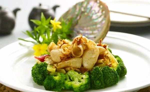 鲍鱼去肚洗净切片,焯水后捞出放入冰水中浸泡