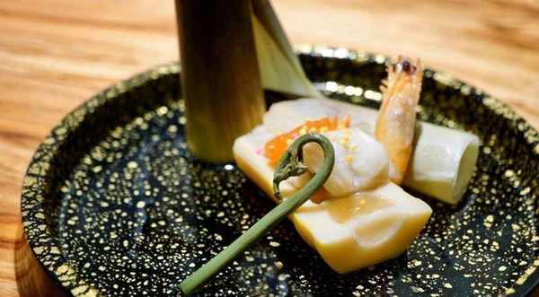 鲜笋1根、基围虾1只、黄鱼肉1块、大米100克、蕨菜1根、胡萝卜1片、昆布木鱼高汤1400毫升、味淋180毫升、干辣椒2根、淡口酱油适量