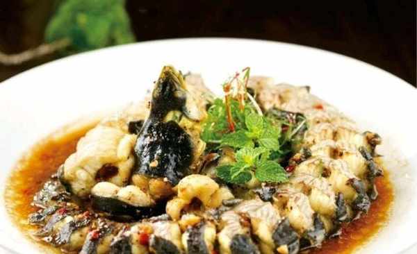 乌鳗鱼500克、豆豉酱30克、葱白末8克、姜茸3克、蒜蓉3克、红辣椒末3克、葱丝适量、姜丝、蚝油5克、白兰地5毫升、香麻油3克、白糖2克、味精3克、土豆生粉5克、胡椒粉1克