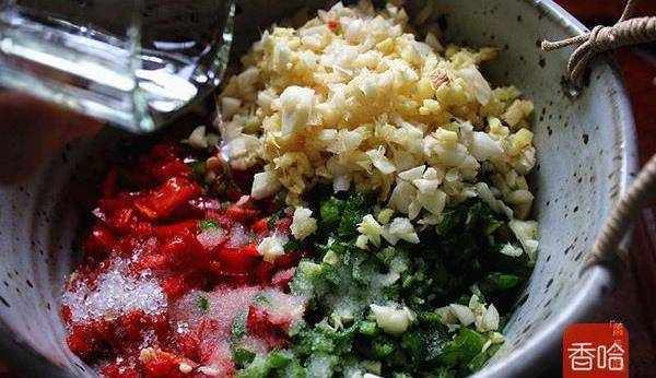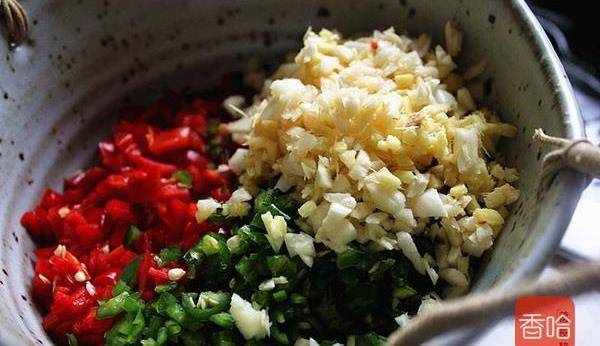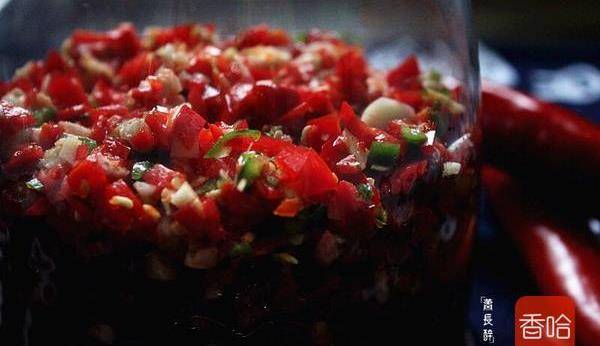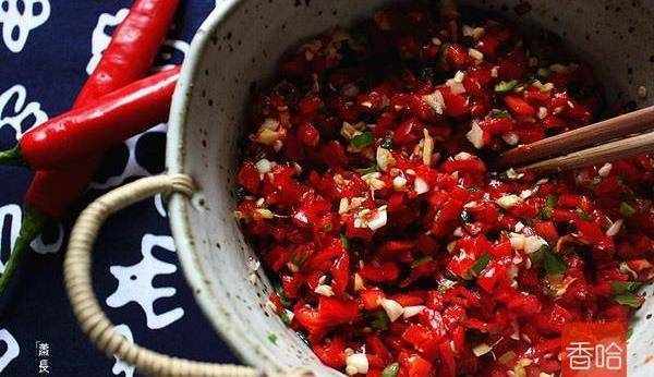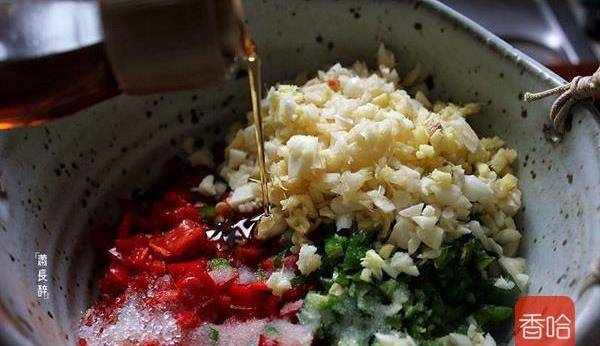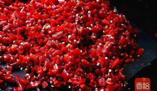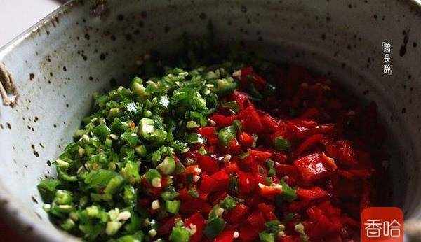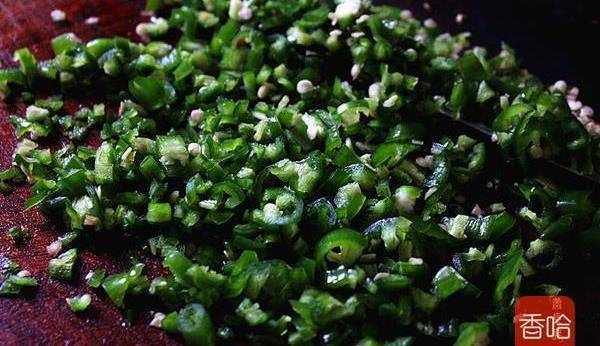 5.二荆条青椒同样处理,剁细。