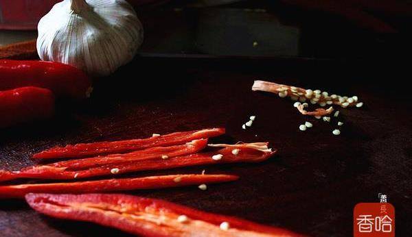 3.辣椒去蒂,切成细丝,辣筋和辣椒籽保留多少决定成品的辣度。
