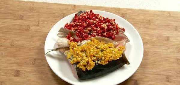 步骤4准备好盘子,放入鱼头,在鱼头一边加入调好的红剁椒,另一边放入黄剁椒。