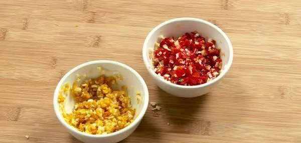 步骤3准备好红剁椒、黄剁椒,分别加入蒜末、姜末、葱末,淋入白酒,搅拌均匀。