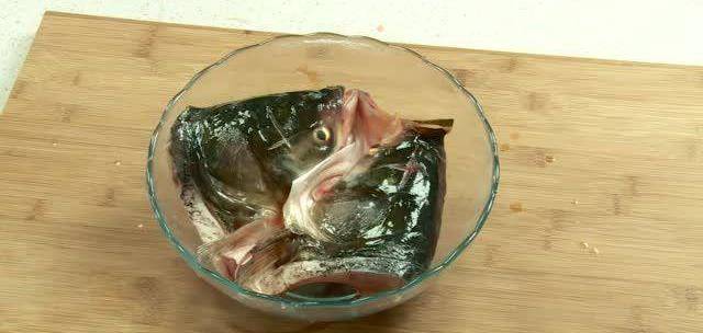 步骤2准备好鱼头,两面均匀撒上盐、淋入适量白醋、白酒,抹匀。
