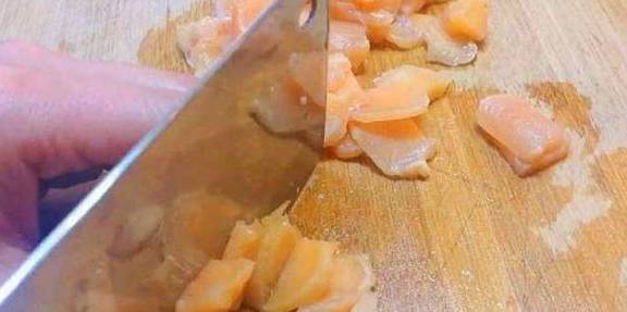 1、首先将鸡胸化冻,先切成片,随后再改刀成和巴达木差不多大小的块备用,cathy这里用的鸡胸是速冻鸡胸,大家如果有条件的话尽量买新鲜的鸡胸,营养价值更高