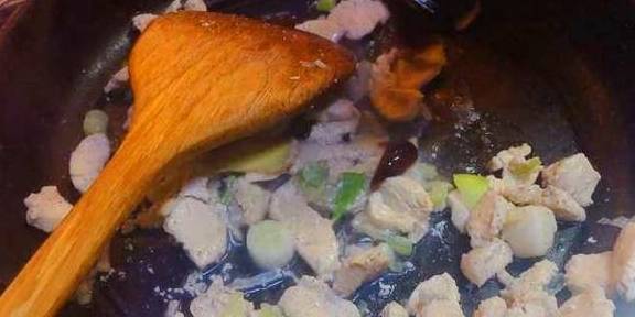 4、随后上炒锅,在炒锅中先加入半碗水,再加入适量的料油,烧开以后将葱姜和腌好的鸡胸肉放入锅中翻炒至变色,再加入适量的蚝油,生抽翻炒均匀