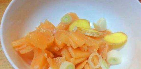 2、将葱姜改刀,葱切成小段,姜切成薄片,放入切好的鸡胸中,随后加入适量的料酒,黑胡椒,抓匀并腌制十分钟左右,cathy这里没有采用传统的用盐腌制的方法,就是为了减少盐的摄入量