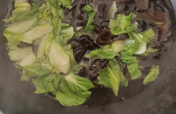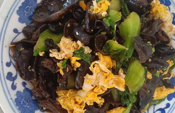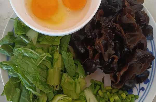 主要食材:木耳一把,油菜二棵,蒜苔一根,两个鸭蛋。