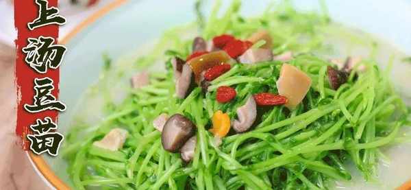 材料:豆苗300克,上汤配料:香菇丁,肉末,枸杞。