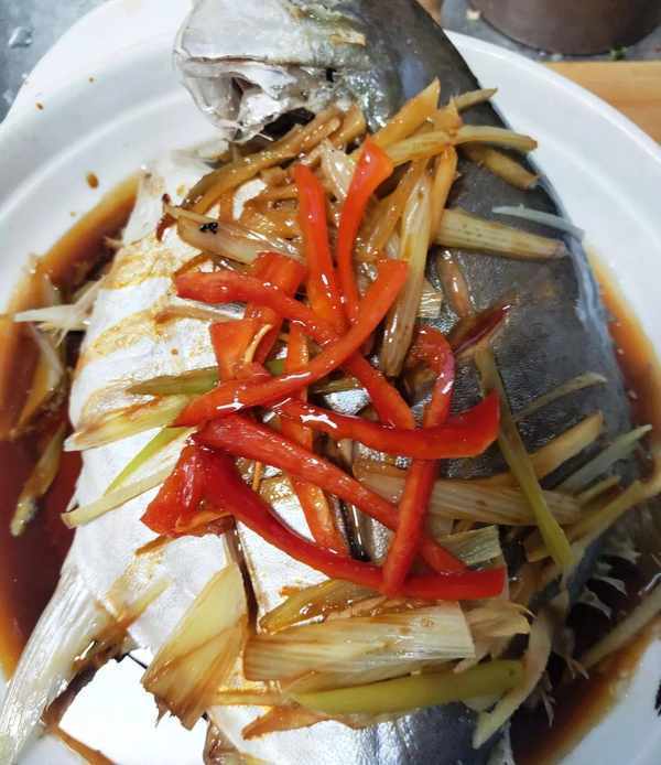 鲳鱼肉厚,需上汽后大火蒸10——15分钟左右!倒去汤汁放红椒丝点缀一下 ,淋生抽少许,浇热葱油即可!