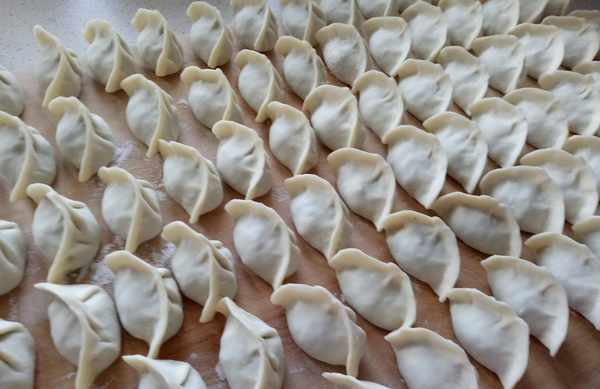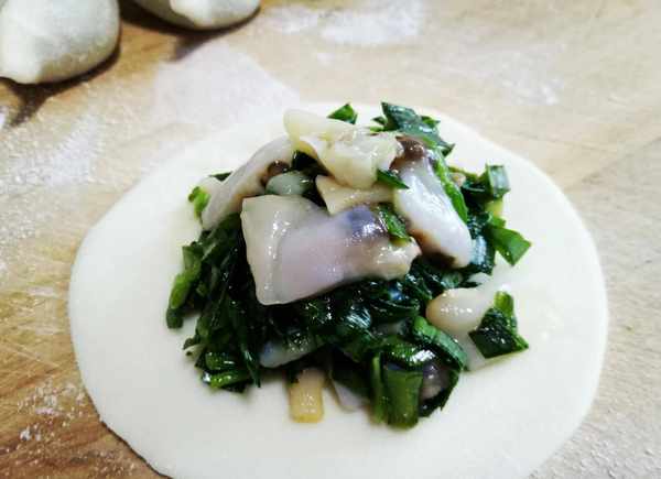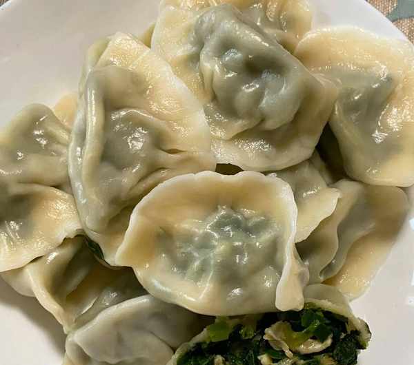 韭菜菠菜蚬子肉,这种馅儿还是第一次包,尝尝气质,蚬子肉相当给力,鲜得有些过分;菠菜和韭菜则完全融合在一起,韭菜原本的辣味已根本吃不出,反而还有一点点甜。由于食材新鲜,馅料比例合理,这饺子鲜鲜美美、清清淡淡,真是越吃越好吃,只怕又要吃多了。