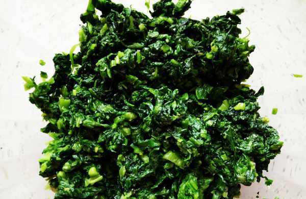 菠菜摘洗干净、焯水、攥干、切末、再攥干水分;