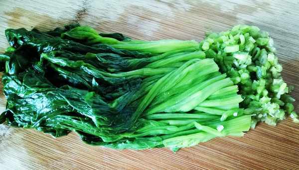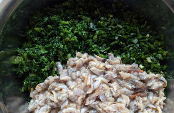 菠菜末中加盐、油适量拌匀(将馅料中需加的盐量分两部分,一部分加在此处,另一部分加在蚬子肉中);