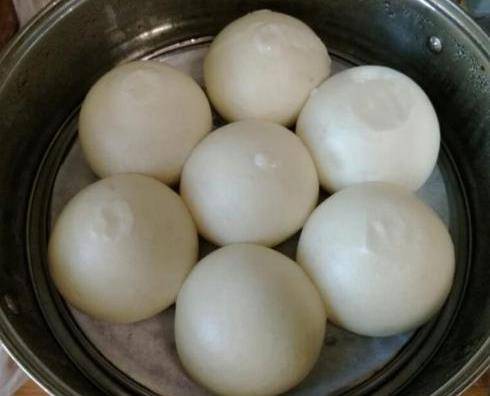 4,蒸锅中加入清水,把馒头坯子放在蒸屉上,盖上锅盖,让馒头在蒸锅中醒了40分钟,我们通常蒸馒头的时候,二次发酵20分钟就可以了,但是我们的面是没有发酵过的,所以需要醒发的时间就会长一些,当我们打开锅盖看到馒头胖了一圈,那就表示已经醒发好了。大火烧开后再蒸20分钟馒头就蒸熟了。