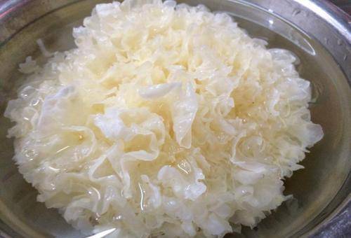 第一步制作:干白菇一个用清水泡发,放入白菇至膨胀,用手撕开白菇根部黄色部分,用手将白菇撕成小花,沥干水分水以备后用。