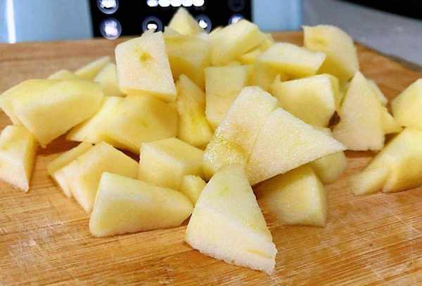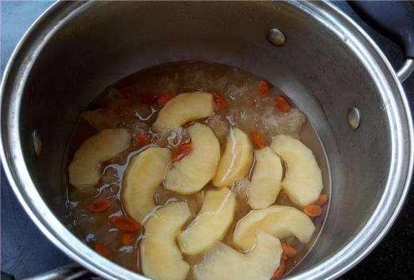第四步做:然后继续煮20分钟,把苹果块全部下锅,等银耳开始出胶,苹果全部煮熟,苹果里的营养成分都在汤合并。