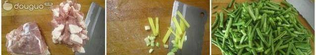 1.准备好材料,豆角洗净择好切段,肉切条,西红柿洗净切滚刀块,葱切花,姜切条。