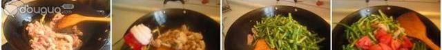 3.锅烧热,倒入油,放入葱姜炒出香味,放入肉条继续翻炒,倒入西红柿和长豆角,放入酱油(生抽)。放入豆芽,继续翻炒,放入少许盐。