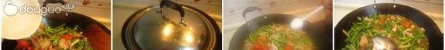 4.加入少许水,再翻炒一会儿,然后把锅盖盖上,闷一会儿。炖到豆角变烂,颜色变深,西红柿出水。