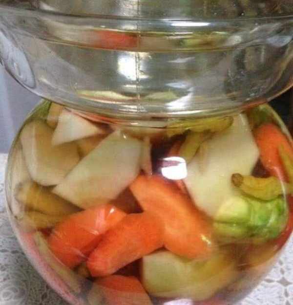 把玻璃瓶清洗干净沥干水分后,加入自己喜欢吃的材料至满,然后就加入刚才煮好的泡菜水8成满,然后再加入野山辣椒水至满,最后再加入一点高度白酒,盖上盖子密封阴凉处放置发酵,加入野山辣椒水可以加速发酵过程。