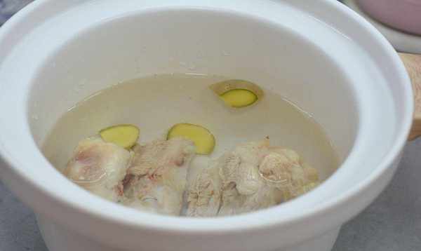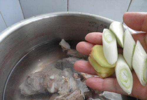 第五步煮:排骨用冷水泡一下,去除表面的血腥,将焯过水的排骨倒入锅中,放入适量姜片,加入适量清水,大火烧开汤汁,即可。舀出来把浮起的白色血沫丢掉。