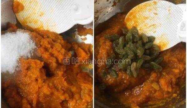 5.南瓜蒸熟捣成泥状趁热加入15克的白糖和适量的葡萄干搅拌均匀放凉备用