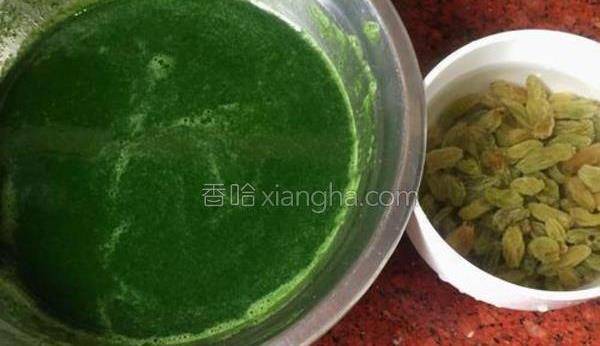 2.菠菜加适量的温水榨汁备用,葡萄干事先泡30分钟