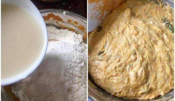6.放凉了之后在加入200克的面粉,3克的发酵母用温水冲开倒入面粉中用小铲子和成面团