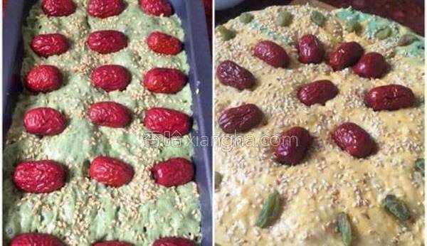 11.发酵好了在上面撒一些芝麻、葡萄干和红枣,放入蒸笼里蒸30分钟