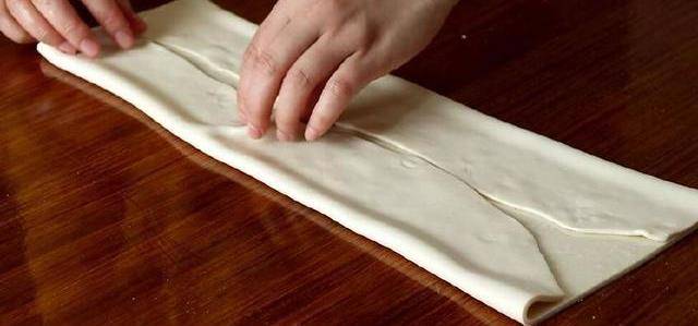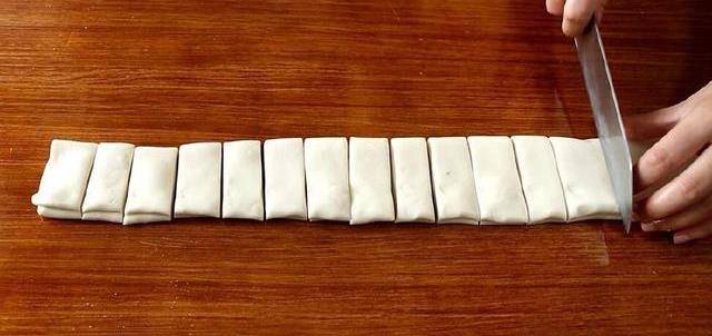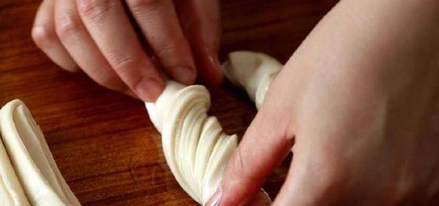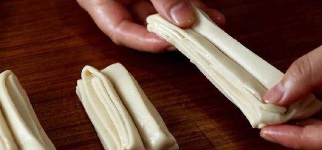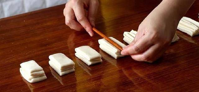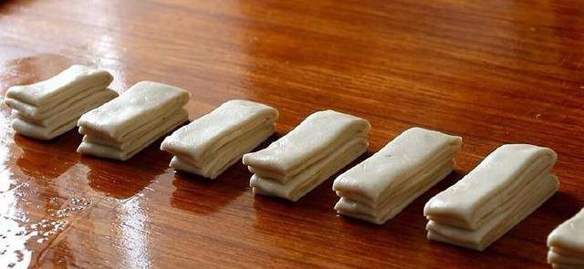 用刀切成小段,将两块面剂子叠一起,用筷子竖着压一下,然后稍微放置一会儿,拉长,拧一下。