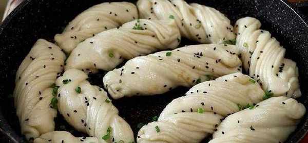 盖上锅盖焖煎,等锅内没有水的时候,即可开盖,撒上切好的小葱末和熟黑芝麻,然后再稍微煎一会儿。(黑芝麻和葱末儿早些撒,可以粘在花卷上面。)