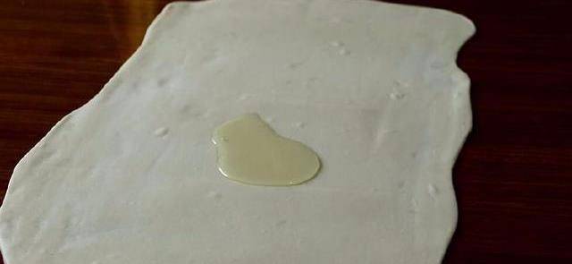 将揉好的面团盖上一层保鲜膜,稍微醒一会儿,然后擀成大薄片,刷上一层油,撒上一点盐,将饼皮对折式的叠起来。