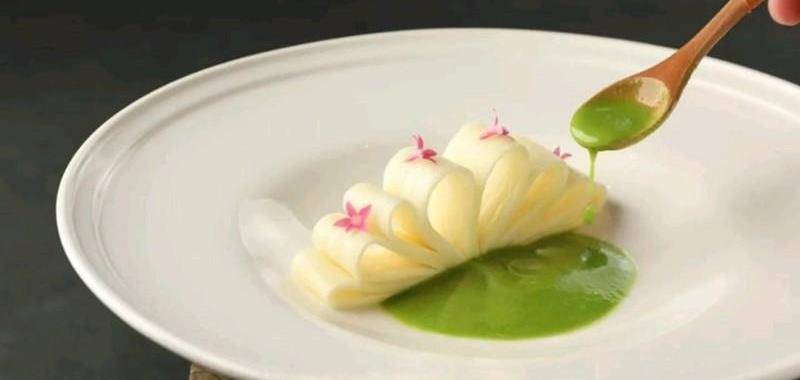 青花椒、葱叶一起放入料理机中,加入橄榄油、盐、鸡汁打碎,过滤后浇在摆好盘的茭白上即可