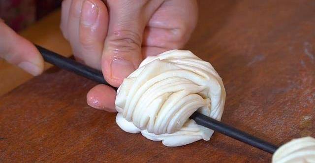 4,把两个小剂子摞起来,用筷子按压一下,把面挤拿起来,筷子放在下边,捏住面挤两边旋转取出筷子,一个漂亮的小花卷就做好了。