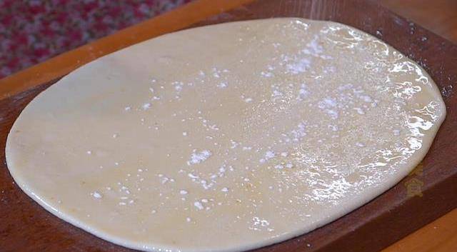 3,把揉好的面不用醒发,直接擀成薄饼,刷上一层食用油,撒上一点食盐涂抹均匀,再撒上一点干面粉。从一边卷起切成大小均匀的小剂子。
