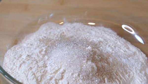 1,盆中加入400克面粉,4克酵母,一勺白糖促进发酵,用23毫升温水和面随倒随搅拌。