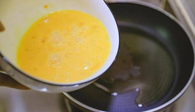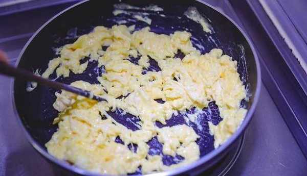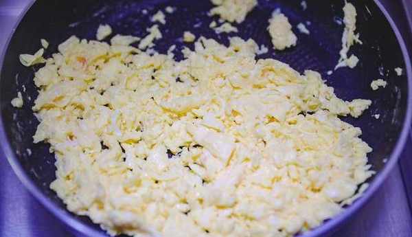 鸡蛋放入碗中打散,凉油凉锅的时候放入蛋液,开中小火,用筷子顺着一个方向不停搅动,就会搅成图中的颗粒状态。