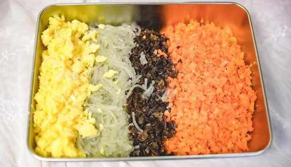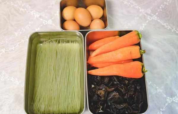 制作这道美食需要的食材有鸡蛋若干,粉条适量,胡萝卜适量,木耳适量。粉条提前用凉水泡软。
