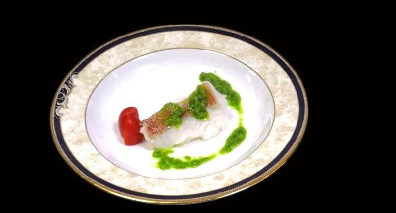腌制好的鱼肉放入锅中,煎制一面金黄,放入碟子上,蒸4分钟,淋上调好的绿葱酱,用小番茄点缀即可
