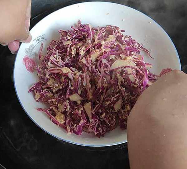 ①紫甘蓝富含花青素,遇碱变蓝,遇酸变粉紫,所以加点醋让它颜色好看些,又因含醋怕酸,再加点糖中和一下。②面粉就是做馒头包子的面粉,无所谓高中低筋,都可以用。③面粉的用量不是死的,拌至包裹住每一根紫甘蓝丝即可。④水开上笼,蒸15分钟左右,牙口不好的可多蒸一会。
